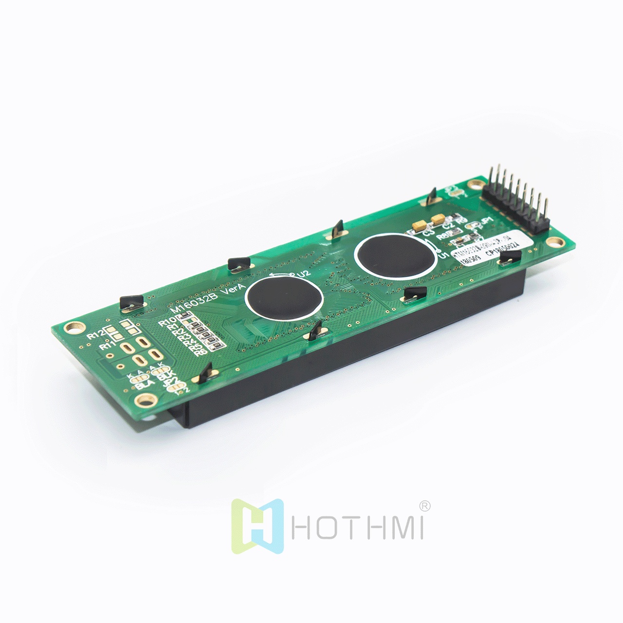 The 3.4" 160x32LCD Graphic Dot Matrix Module displays deep black pixels on a bright yellow-green background. This transflective LCD display is engineered to provide optimal visibility in a variety of lighting conditions in many different environments. In bright sunlight, the display uses its reflective layer to reflect ambient light back to the viewer, making the screen easy to read. In darker environments, the LCD has a strong built-in backlight that provides high contrast and displays clear graphics to the viewer. This advanced display technology ensures that the display is always easy to read regardless of the lighting conditions.
