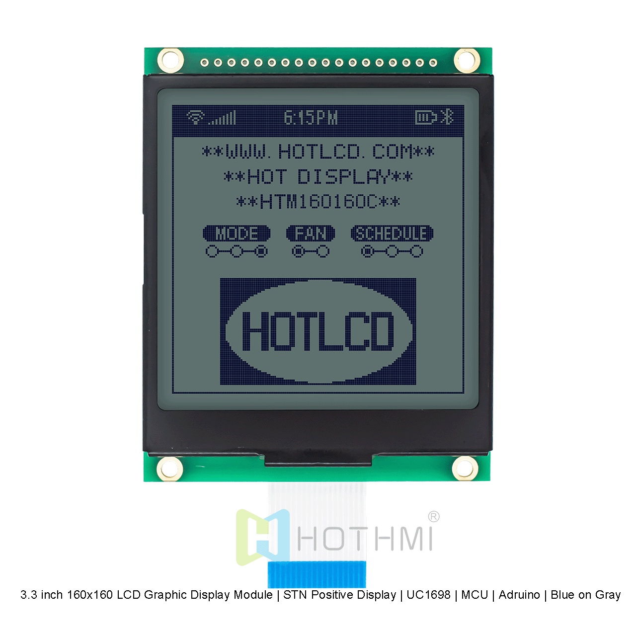 The 3.3 inch 160x160 LCD Graphic Display shows blue pixels on a gray background. This fully transparent LCD display is designed to reflect images to the viewer in bright environments through the reflectivity of the polarizer, and in darker environments, the LCD has a strong built-in backlight to provide high contrast and display clear graphics to the viewer. This advanced display technology ensures that the display is always easy to read regardless of lighting conditions.