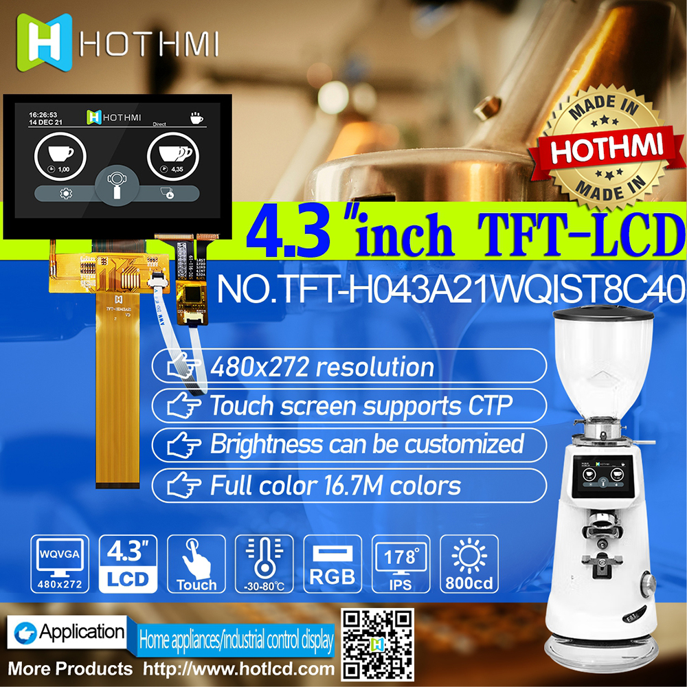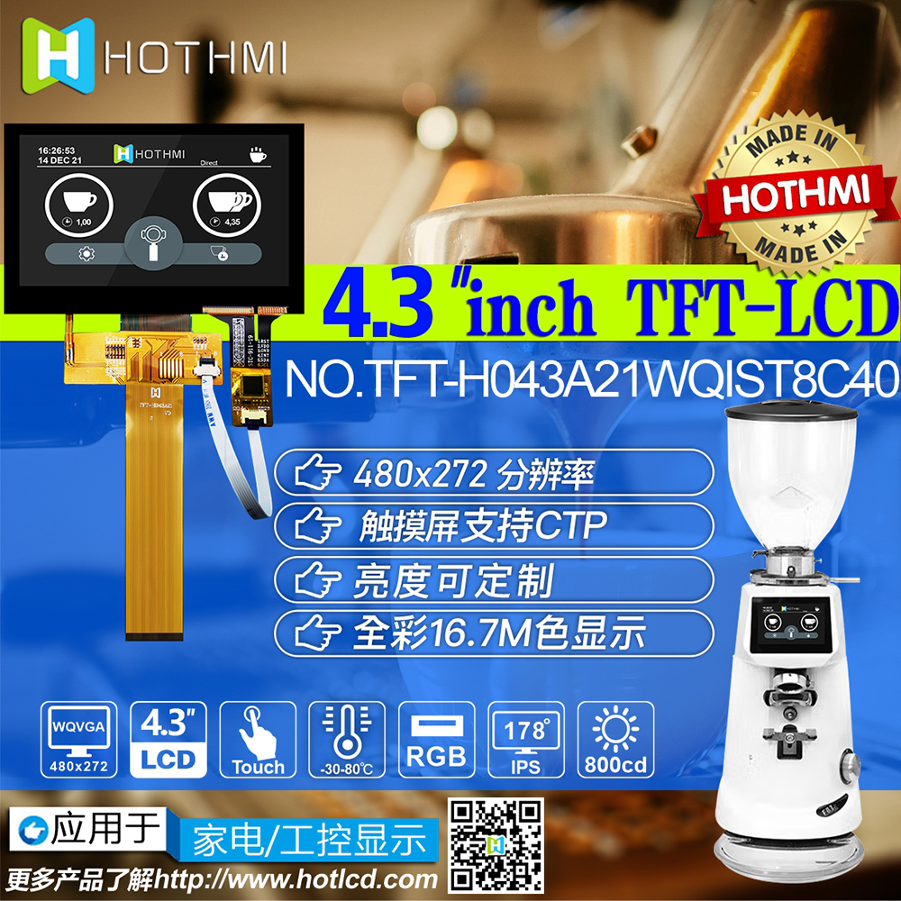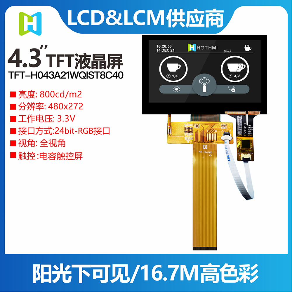4.3 inch TFT color screen / 480*272 resolution / full viewing angle IPS process / RGB 24Bit / IIC interface / TFT-H043A21WQIST8C40 / used in coffee machines, home appliances, industrial control, medical display equipment, visible in sunlight4.3寸TFT-H043A21WQIST8C40詳情3.jpg4.3寸TFT-H043A21WQIST8C40詳情4.jpg