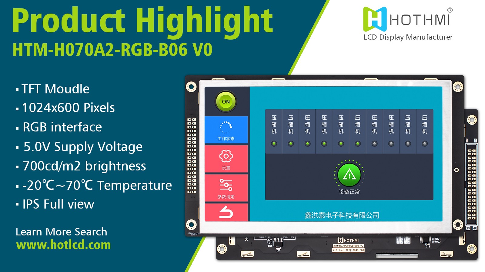 Introducing the HTM-H070A2-RGB-B06, a cutting-edge 7-inch IPS TFT LCD module display panel with a controller board. This remarkable display boasts a high-resolution of 1024x600 pixels, ensuring crisp and vibrant visuals that will captivate your audience.