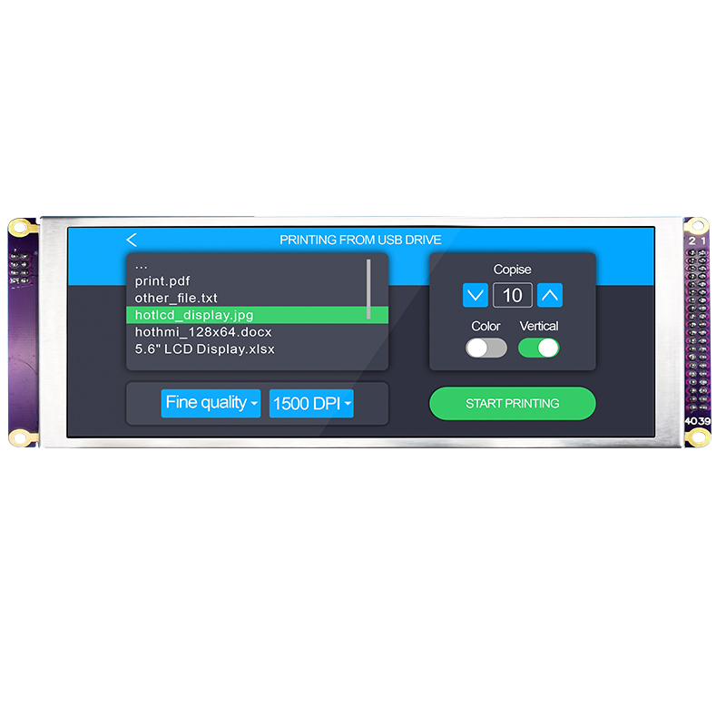 Screen Type: 7.84-inch Bar Style IPS TFT LCD Display Resolution: 1280x400 pixels LCD Controller Board: Included Luminance: 450cd/m2 Interface: MCU+SPI TFT Module Operating Temperature Range: -20°C to 70°C Built-in Graphics Processor Single Chipset: 8051 Supports STM32 series chipsets