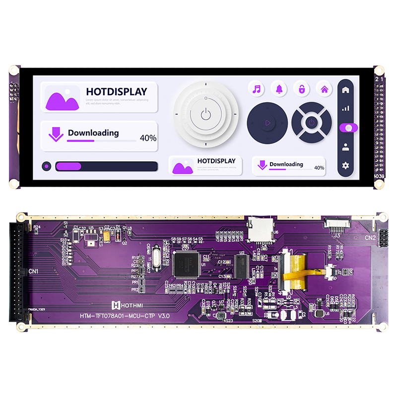 The HTM-TFT078A01-MCU is a high-quality 7.84-inch Bar Style Capacitive Touch IPS TFT LCD Display designed for car monitors. It features a resolution of 1280x400 pixels and comes with an included LCD controller board. With a luminance of 450cd/m2, it offers bright and clear visuals. The display interface supports MCU+SPI, and it comes as a TFT module.