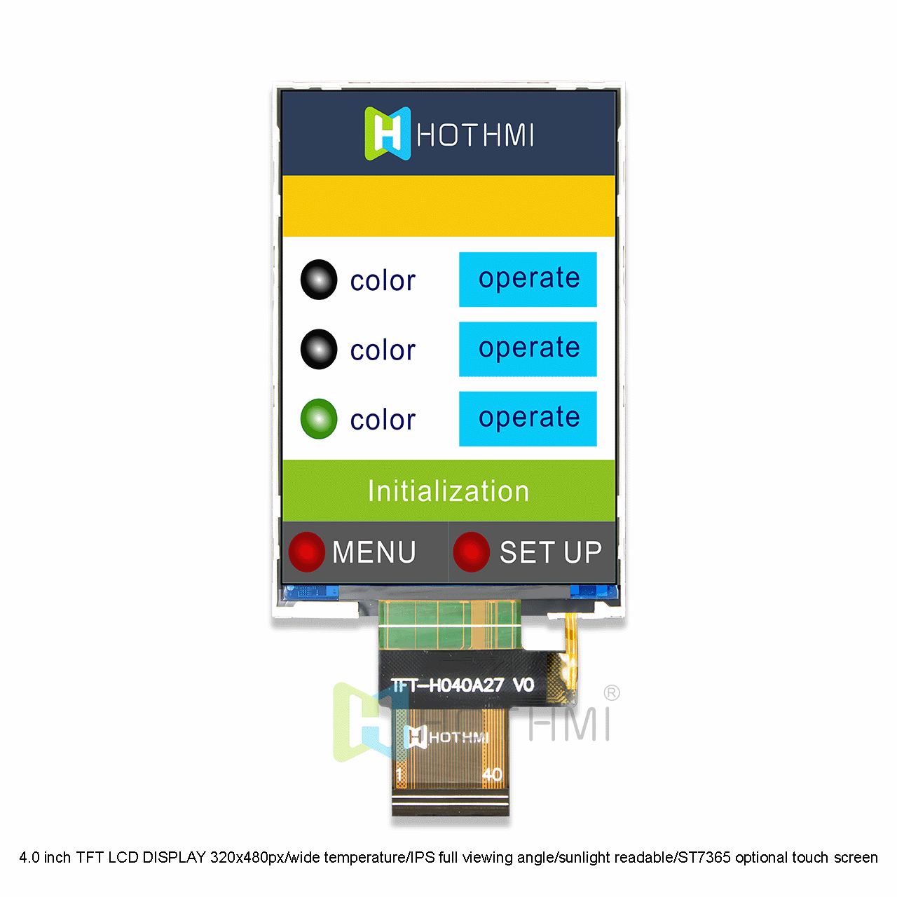 TFT-H040A27FWIST5N40是4.0英寸彩色液晶模組,分辨率320x480,內置ST7365控制器,可選觸摸屏,畫質高,IPS廣視角,支持8080 8位、9位、16位、18位 位并行接口和3線、4線串行接口,65K/262K真彩,FPC連接(可選連接器),2.8V~3.3電壓,支持垂直顯示。 所有材料均符合環(huán)保要求和 RoHS 標準。 該模塊廣泛應用于各種儀器儀表、智能設備等,適用于8051 PIC、AVR、ARDUINO、ARM、Raspberry Pi等單片機開發(fā)平臺。