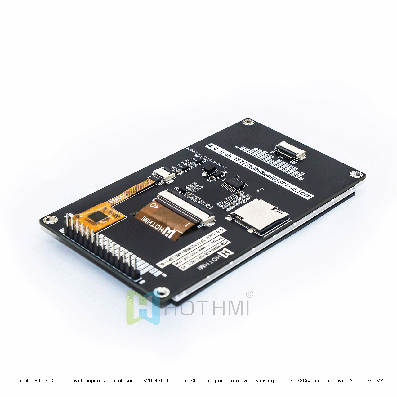 HTM-H040A28-SPI-A01C is a 4.0-inch IPS LCD module with plate - capacitive touch display with a resolution of 320X480 pixels. It uses ST7365 display driver IC, plug-in PIN pins, and is also compatible with FPC cables and can be used with matching connectors. The wide viewing angle used in this display ( U70/D60/L70/R70) technology provides full viewing angle and excellent color performance, allowing you to easily watch from all angles without distortion. The display has a high contrast ratio of 500:1, capable of displaying deep blacks and vivid colors. With a brightness of up to 330cd/m2, it can be read under sunlight. FPC connection (optional connector), 3.3V voltage, supports vertical screen display. All materials comply with RoHS environmental protection standards. The module is widely used in various instruments, industrial computers, smart devices, etc. It is suitable for a variety of microcontroller development platforms such as C8051/Arduino/STM32.