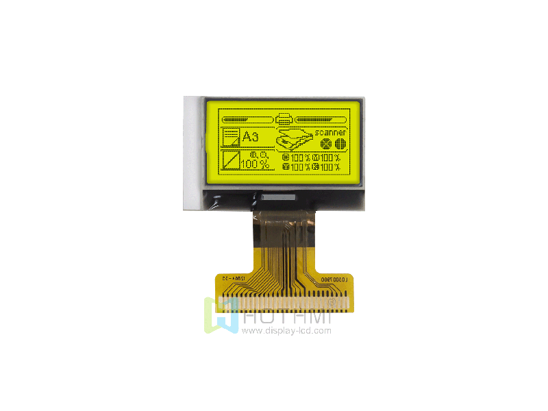 3.1 inch 128x64 Graphic COG LCD / Yellow-Green Backlight COG / STN+Gray / Arduino HTG12864-127-11Y-20C10-V01 COG Graphic LCD 128x64 87.6x50.4x0.3 70.0x37.0 65.27x32.63 0.51x0.51 6H STN(+) Yellow-green FPC-20PIN MCU Anti-static ESD 8KV -20~70℃ +3.3 V ST7565R