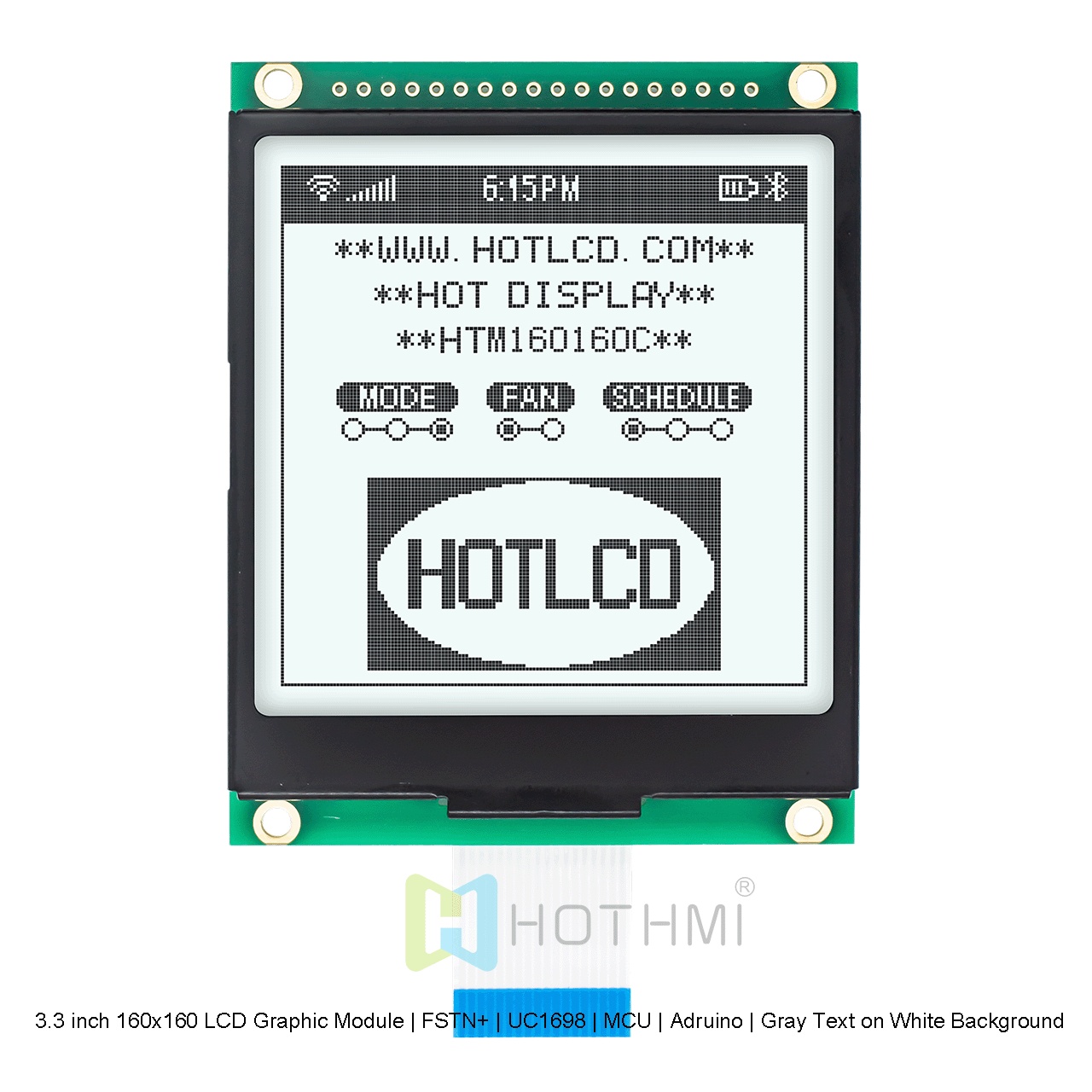 3.3 英寸 160x160 LCD 圖形模塊在白色背景上顯示深灰像素。這款透射式 LCD 顯示屏經(jīng)過精心設計,可在較暗的環(huán)境下使用時提供最佳的可視性和令人印象深刻的色彩。顯示屏內(nèi)置強背光,可提供高對比度并確保屏幕上所有圖形的易讀性。