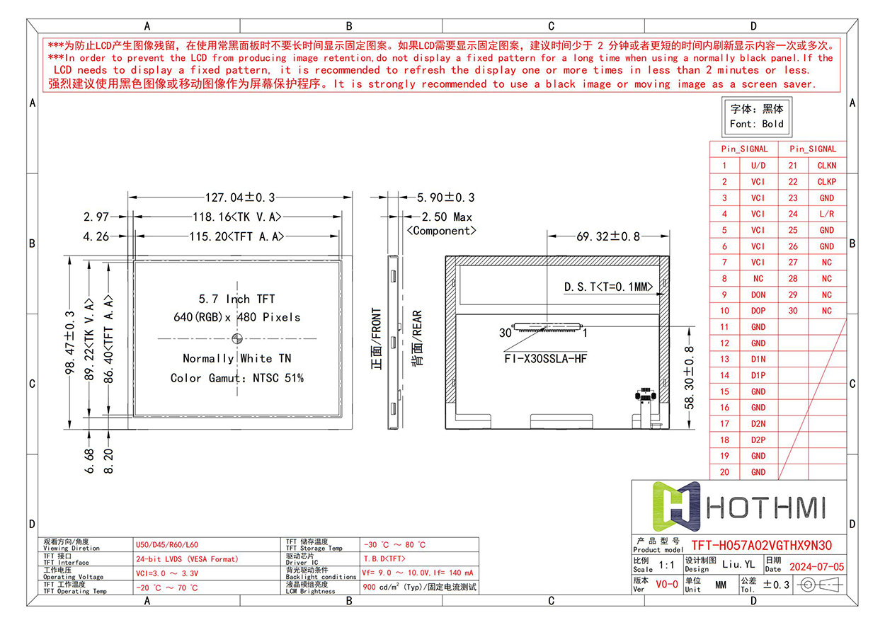 本產(chǎn)品為5.7英寸TFT顯示屏采用常白模式(Normally White TN)設(shè)計,分辨率為640(RGB)×480像素,色彩覆蓋率為NTSC 51%,支持24位1MIS(VISA格式)數(shù)據(jù)接口。屏幕工作電壓范圍為3.0~3.3V,環(huán)境溫度適應(yīng)性強(qiáng),可在-20°C至70°C條件下穩(wěn)定運行。