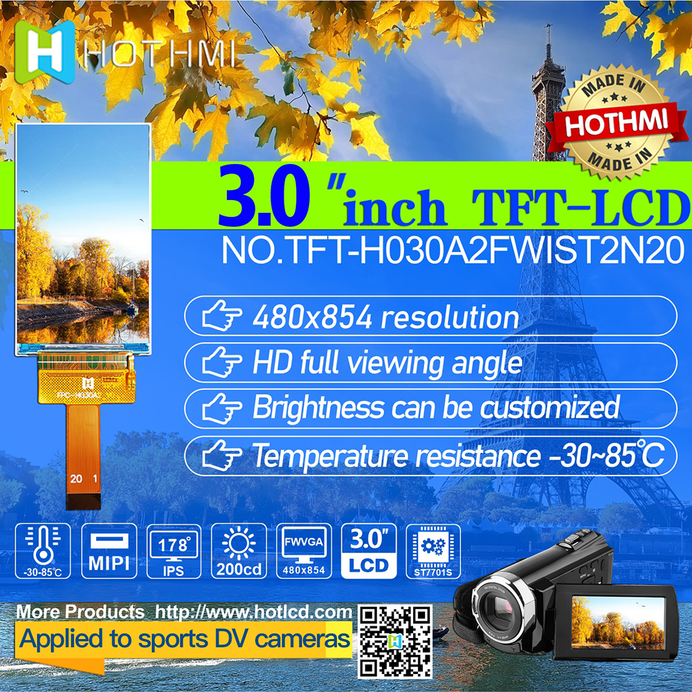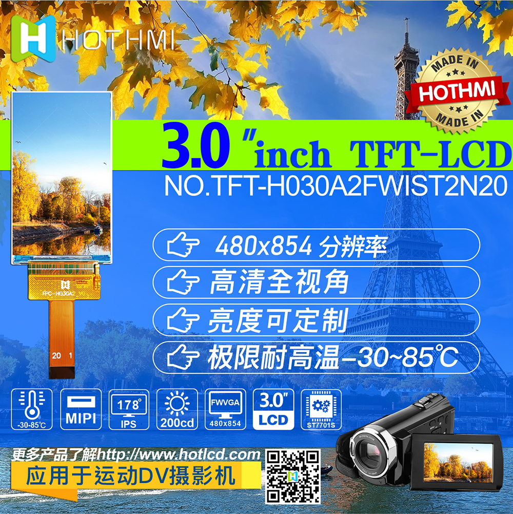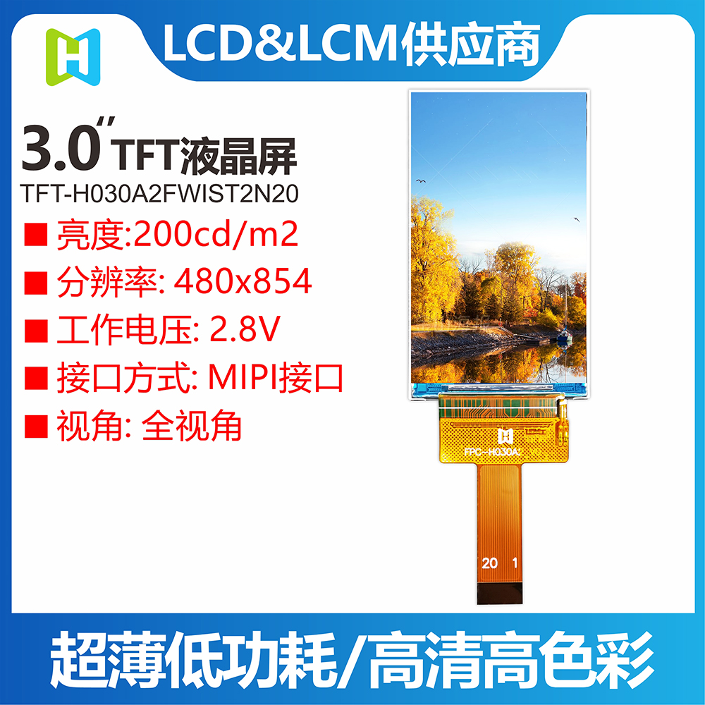 TFT-H030A2FWIST2N20是鑫洪泰HOTLCD于2021年3季度推出的一款3.0寸高清TFT顯示屏,分辨率高達480*854,也是目前3寸TFT分辨率最高的一款,H030A2采用IPS寬視角工藝,MIPI接口,非常適合一些運動DV攝像機等高端智能產(chǎn)品選用。