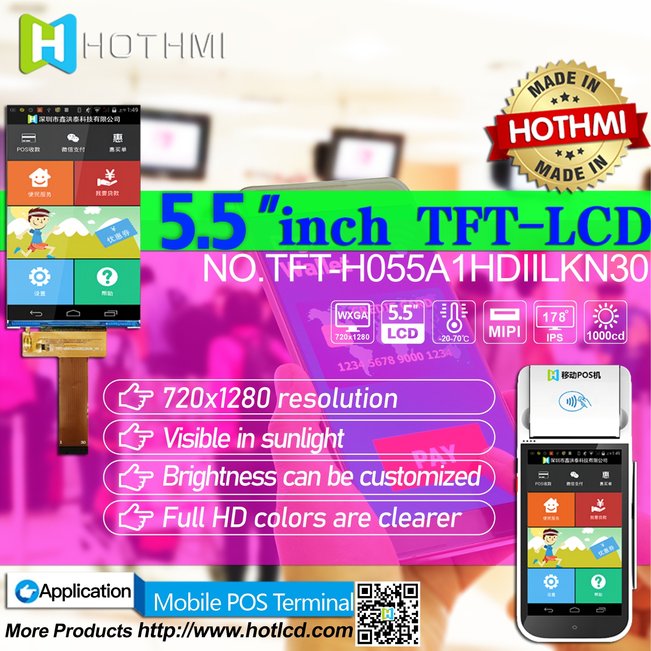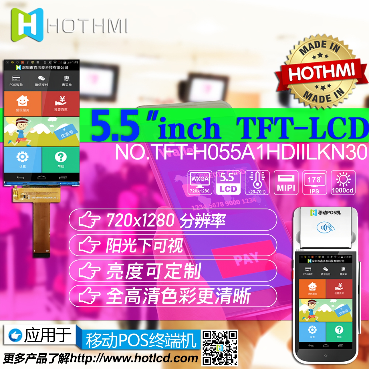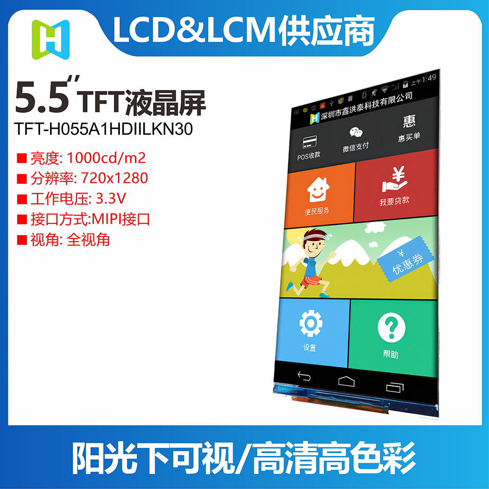 • 型號: 5.5寸TFT彩屏 | 720x1280高清 | 1000亮度 | MIPI接口 | TFT-H055A1HDIIL3N30