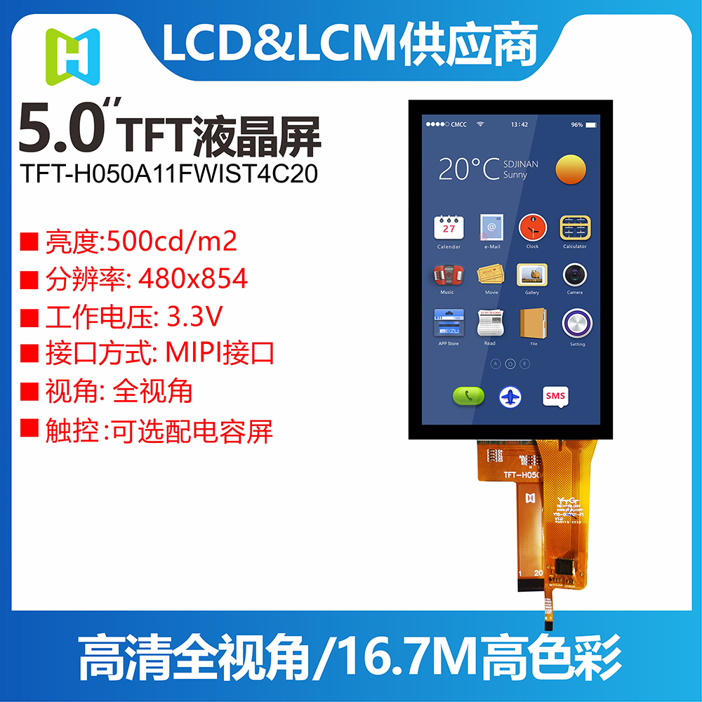 TFT-H050A11FWIST4C20 是一款 5.0 英寸寬溫 IPS TFT-LCD 顯示器,帶有投射電容式觸摸屏,分辨率為 480x854 像素。 模塊內(nèi)置ST7701驅(qū)動IC,支持MIPI接口。 TFT-H050A11FWIST4C20采用IPS面板,具有視角更廣的優(yōu)勢,左:80/右:80/上:80/下:80度(典型),對比度800:1(典型),亮度500尼特(典型) ) 值),眩光面板,16:9 縱橫比。 觸摸屏內(nèi)置GT911 IC,支持I2C接口和多點觸控功能。 H050A11 型號具有投射電容式觸控面板 (PCAP),但沒有觸控面板選項 (TFT-H050A11FWIST5N20)。 TFT-H050A11FWIST4C20的供電電壓(VCC)為3.0V至3.6V,典型值為3.3V。 它可以在 -20°C 到 +70°C 的溫度和 -30°C 到 +80°C 的存儲溫度下工作。