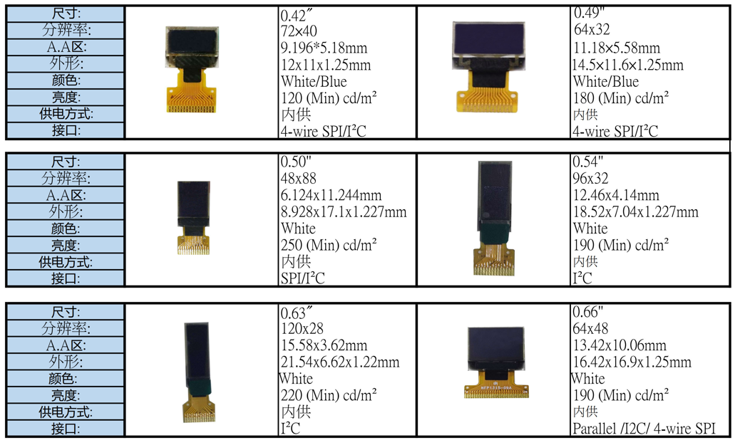 0.42寸OLED、0.49寸OLED、0.50寸OLED、0.54寸OLED、0.63寸OLED、0.66寸OLED、0.69寸OLED、0.77寸OLED、