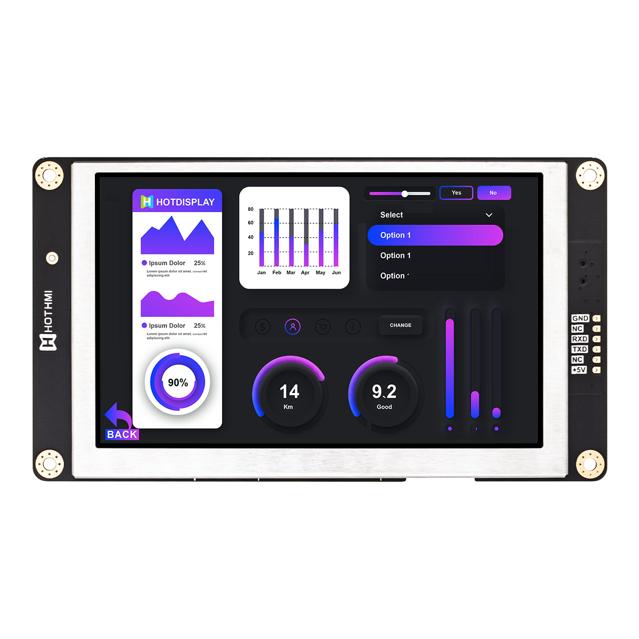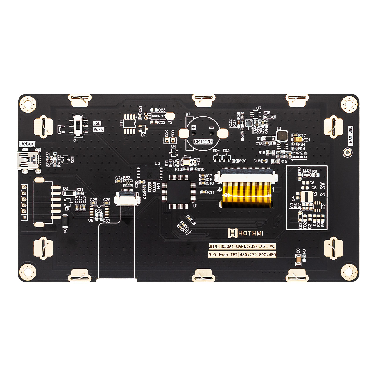 HTM-H050A1-UART-A5是一款 5.0英寸 IPS TFT 顯示屏,分辨率為 800x480 像素。它是一款帶有智能顯示功能的顯示屏,有UART接口,人機(jī)信息交換功能。除了控制器之外,我們的 HMI 顯示器還集成了 MCU 功能。MCU 通過(guò) UART 接口接收主控制板(客戶端)發(fā)送的命令,然后根據(jù)這些預(yù)定義的指令顯示文本、圖像或動(dòng)畫。主控制板(客戶端)上的 MCU 不需要專門針對(duì)圖像顯示的復(fù)雜編程或執(zhí)行。您可以使用我們的 GUI 設(shè)計(jì)軟件 - UI 編輯器輕松創(chuàng)建文本、圖像或動(dòng)畫。無(wú)需編程技能。
