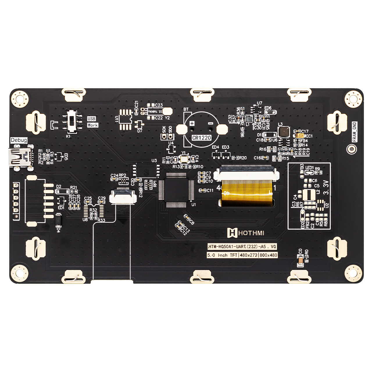 HTM-H050A1-UART-A5R是一款5.0英寸 IPS TFT 顯示模組,分辨率為 800x480 像素。它是一款帶有智能顯示功能的顯示屏,有UART接口,人機(jī)信息交換功能。除了控制器之外,我們的 HMI 顯示器還集成了 MCU 功能。MCU 通過 UART 接口接收主控制板(客戶端)發(fā)送的命令,然后根據(jù)這些預(yù)定義的指令顯示文本、圖像或動(dòng)畫。主控制板(客戶端)上的 MCU 不需要專門針對(duì)圖像顯示的復(fù)雜編程或執(zhí)行。您可以使用我們的 GUI 設(shè)計(jì)軟件 - UI 編輯器輕松創(chuàng)建文本、圖像或動(dòng)畫。無需編程技能。這款型號(hào)同時(shí)配置了電阻式觸摸,順暢無阻。